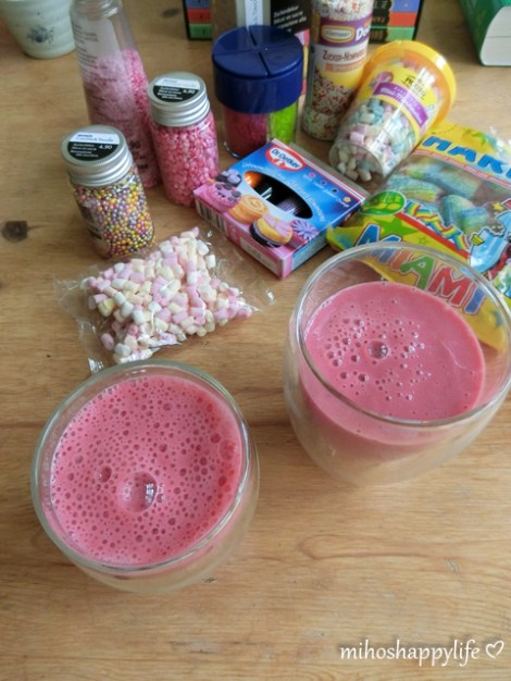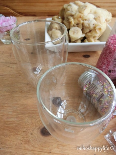 I tried to make my own Unicorn Latte (ok, it is just a banana milkshake with pink food colouring, topped with whipped cream and sprinkles on it, haha) and it surprisingly turned out better than expected. It tasted really good and I wanted to share this simple recipe with you guys. I used: