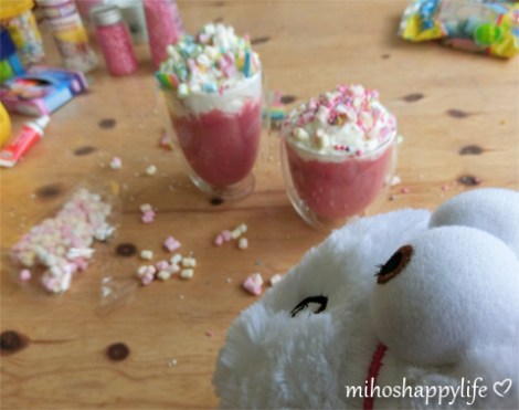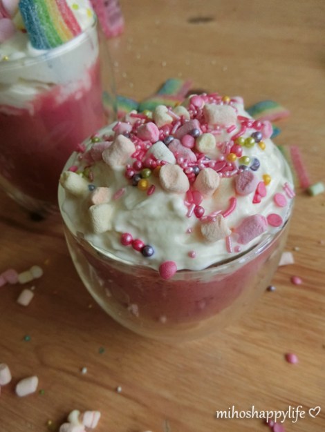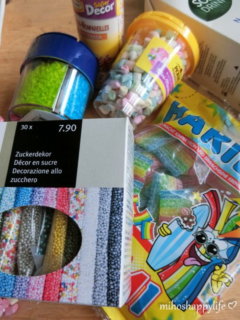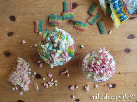 – Mini marshmallow, colourful sprinkles and rainbow belts as decoration on top