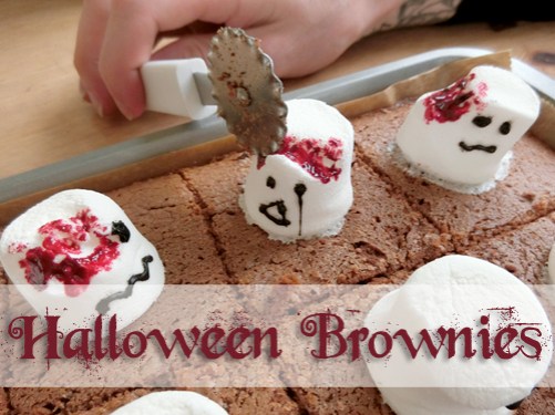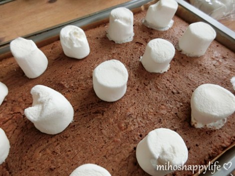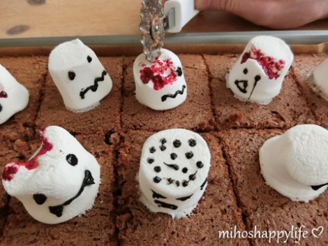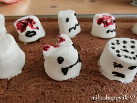 7. Take the finished brownies out and put the marshmallows on the hot cake. Press it down lightly and decorate it with chocolate or fake blood (red food colouring)