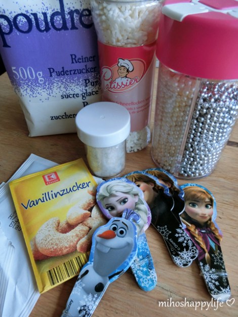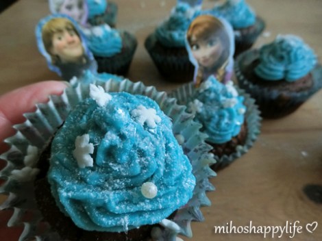 I added some to my doughOh Elsa… I am sorry, haha Ready for the frosting? Sugar flakes, which look like snow flakes Make it blue high in calories, but highly popular