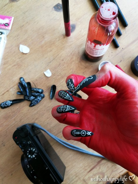 Are you ready to rock the night? It’s Hallowèéèééèen tomorrow~!!! I did another make-up tutorial together with my hun. I went for a bloody vampire look, which is very simple to create. You need a black and red eyeshadow, red eyeliner and some fake blood. Feel free to add some spooky jewellery or accessories to your look. I tried some super long halloween nails – which looks super cool but – to be honest – are very unpractical lol. I couldn’t even take a pen or something with those nails, haha. Anyhow, I witch you a happy Halloween!