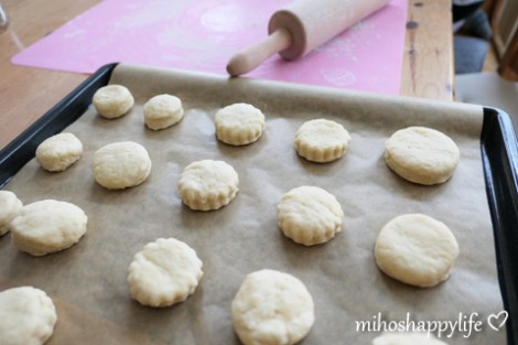 5. Roll out the dough to a thickness of 2cm and cut out approx. 12 circles with a glass or cookie cutter (I used different sizes from Ø 5 – 7cm). 7cm is actually a great size for an “normal-sized” scone.