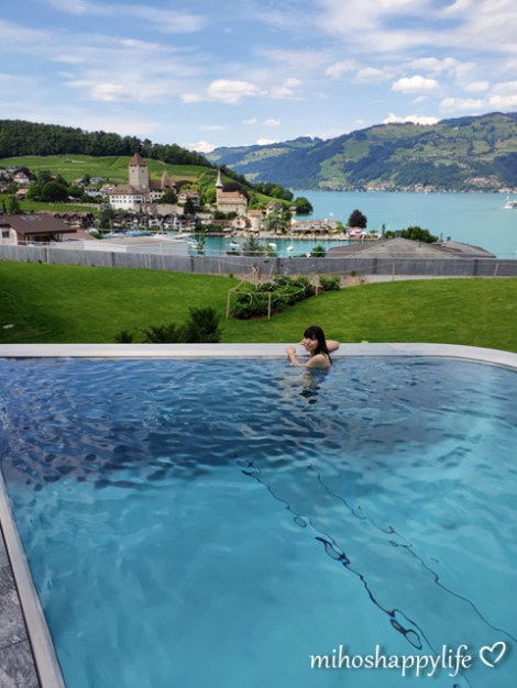 Switzerland has more than good chocolate and cheese! We all know that this beautiful country is filled with a lot of charm. It’s actually a pity that I don’t spend my vacations in my home country so often (if it wouldn’t be that expensive, arg)! Travelling has become very difficult at the moment – 2020 is a crazy year – but let’s make the best out of it! I have been to Spiez with my love, a small town on the shore of Lake Thun in the Bernese Oberland region of canton Bern. We booked a lovey-dovey package at Weekend4Two (a Swiss travel agency, which offers a lot of great packages!) to celebrate our anniversary. Everything went perfect (expect the missing afternoon coffee & cake) and the hotel room and facilities were excellent – my highlight was the infinity pool with a wonderful view of Lake Thun.