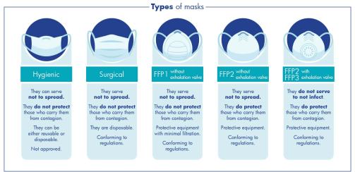 There are several types of face mask – from surgical or medical masks or homemade fabric masks. Regarding reusable masks, there are different shapes, materials and patterns available. Some look like surgical masks (round/oval shape) and others have the typical shape of the blue medical mask (rectangle with 3 evenly-spaced pleats). Choose material that filters out infectious particles (for example dish towel or cotton). Masks with minimum two layers or more are the best choice.