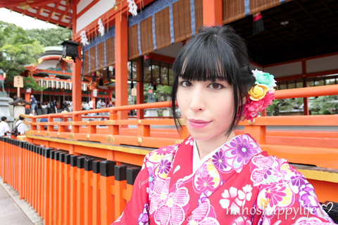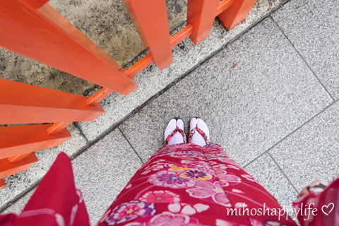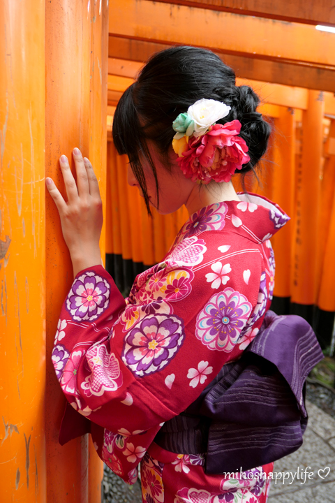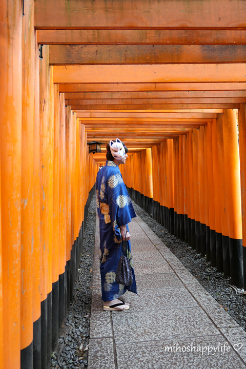 They had a lot of beautiful Kimonos, so I was overwhelmed by too many choices! My boyfriend picked a blue one and I went for a red one. The staff will help you to get dressed, so we didn’t have to do anything special than standing still. After having changed the clothes, we could choose a matching traditional handbag and afterwards, my bf was waiting for me until I got finished with my hairstyling. The lovely staff made me a pretty updo hair style and we were finally ready to stroll around Kyoto!! There are many beautiful places in Kyoto, but I had the urge to take pictures at the Fushimi Inari Shrine and its thousands of vermilion torii gates. As I already mentioned, there is a station called Kiyomizu-Gojo just next to Yumeyakata, so you can directly take the train to Fushimi-Inari station within 10min. All in all, we were very happy with our experience that we made at Yumeyakata, everything went smooth from the selection, dressing, hairstyling and returning and it was definitely a nice memory that I will never forget. Renting a Kimono is a great thing and I absolutely recommend it to give it a try with friends, with family, with your partner or even if you are alone!