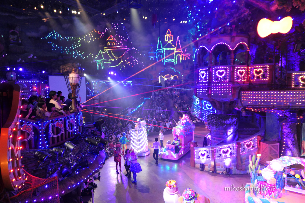 From the moment I entered the park, I was surrounded by vibrant colors and a sense of pure happiness. The atmosphere was filled with charm and a childlike wonder that made me feel like I had stepped into a fairytale. As soon as we arrived, we bought some hair accessories to fully embrace the spirit of cuteness that permeated every corner of Sanrio Puroland, hehe. One of the highlights of my visit was the cute (overprized) themed food and the amazing and magical performance with incredible laser shows and cute Sanrio Characters! Check out my video below, if you want to see a sequence! The various themed areas of the park offered endless adventures. From Kitty’s House to the My Melody Ride, every corner was filled with excitement.