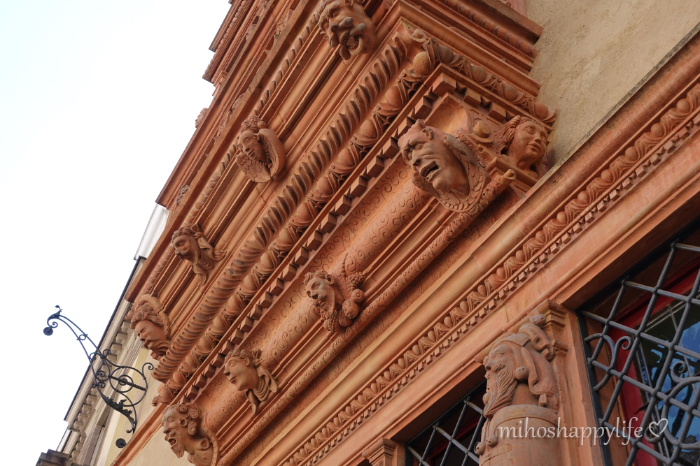 A Renaissance-style building adorned with intricate sculptures of heads, animals and foliage, showcasing the artistic heritage of the region.