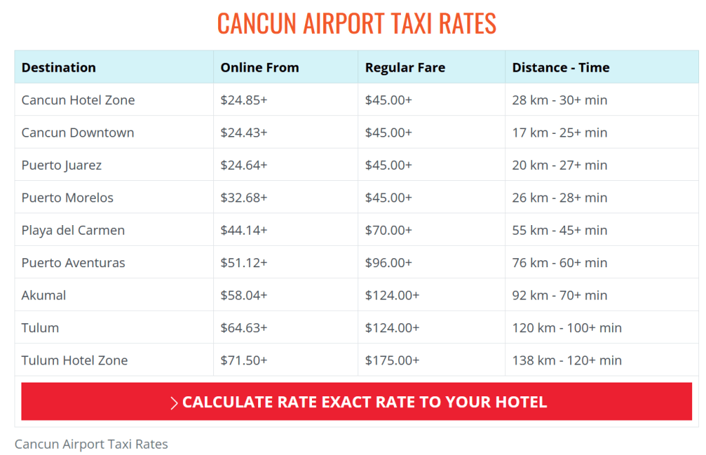We had an organized transportation by Voyage Privé, which was included in the price. However, the cost of a taxi from Cancun Airport to the Cancun resort area typically ranges from $25 to $45 USD, depending on factors such as the exact location of the resort, the type of service (e.g., private vs. shared shuttle), and the time of day.