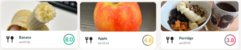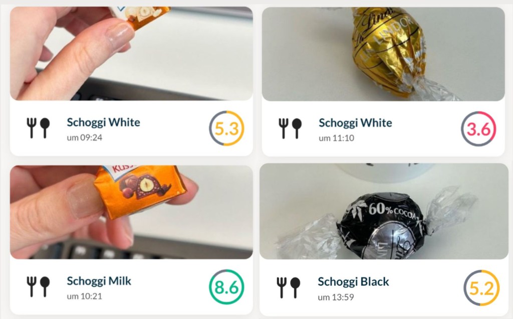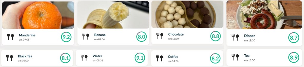 Aside from water, black coffee and black tea (without sugar or milk), the best-scoring food was definitely my dinner with a score of 8.7, consisting of salad, sausage, cheese, cottage cheese and nuts. To my surprise, milk chocolate consistently scored well, ranging between 8.8 and 8.6, lol (not the white one though)! The best fruit (or maybe I just got lucky with the timing?) was mandarin, which scored an impressive 9.2.