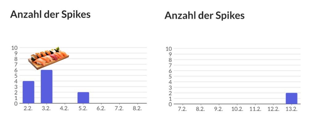 I haven’t done much activity, just walking (which wasn’t tracked), so let’s skip that part. Yes, I am lazy… The day with the most spikes, about 6, was when I had sushi. I’m still shocked *crying*!